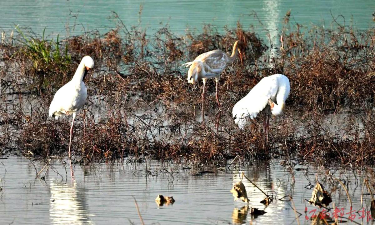 江南都市報訊 全媒體記者許南平攝影報道:12月21日,江西鄱陽湖國家級自然保護(hù)區(qū)管理局科研人員王小龍在地處中國候鳥小鎮(zhèn)的永修吳城鎮(zhèn)鄱陽湖生態(tài)濕地公園科考中,驚喜發(fā)現(xiàn)3只白鶴棲息濕地公園內(nèi)。這是鄱陽湖生態(tài)濕地公園2021年建立以來,首次監(jiān)測到野生白鶴。白鶴是世界極危物種,被列入《世界自然保護(hù)聯(lián)盟》(IUCN)極危物種。目前全球僅存4000余只,其中每年約98%在鄱陽湖越冬。白鶴棲息于開闊平原沼澤草地、苔原沼澤和大的湖泊巖邊及淺水沼澤地帶。其主要以苦草、眼子菜、苔草、荸薺等植物的莖和塊根為食,也吃水生植物的葉、嫩芽和少量蚌、螺等軟體動物、昆蟲、甲殼動物等動物性食物。白鶴是一種冬候鳥,每年六至八月在俄羅斯境內(nèi)的西伯利亞繁殖,九十月在中國東北吉林境內(nèi)的莫莫格濕地停歇一個月左右,再啟程南下至江西鄱陽湖越冬,翌年3月中下旬開始遷飛回北方。