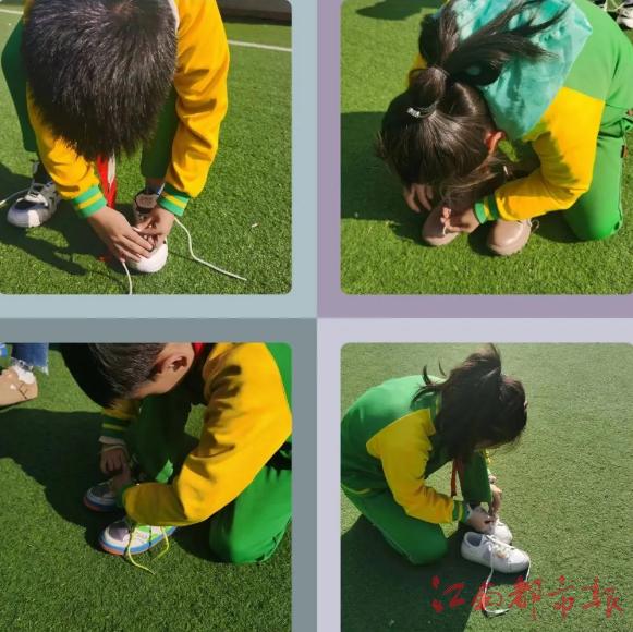 中段勞動(dòng)技能展示主要分為“巧手系鞋帶”“我會(huì)穿校服”,瞧!一只只小手拿著鞋帶在鞋子上飛快穿梭,動(dòng)作迅速而靈活,有“兔耳朵”法,有“虎口對(duì)拉”法,小小年紀(jì),各顯神通!現(xiàn)場(chǎng)一片歡聲笑語(yǔ),也讓孩子們學(xué)到了更多生活技能。