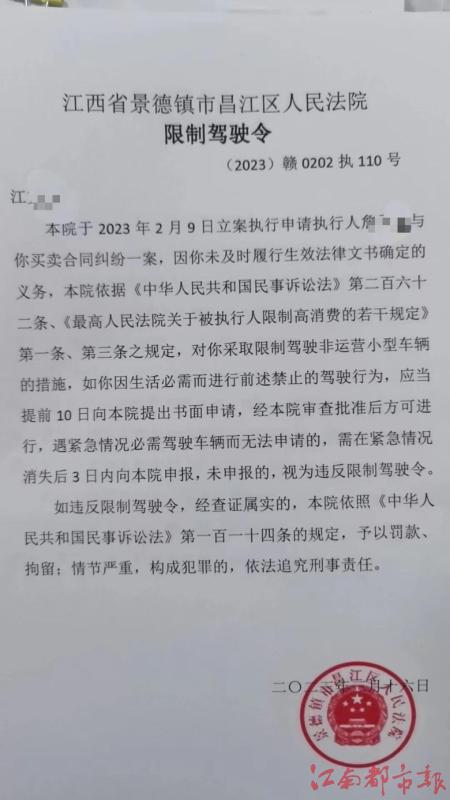 江南都市報訊 方劍、全媒體記者余文斌攝影報道:3月27日,記者從景德鎮(zhèn)市昌江區(qū)人民法院獲悉,該院于近日向江某某發(fā)出了該市首份“限駕令”,通過限制其駕駛非運營性小型車輛的措施,達到有力打擊“老賴”,保障其他當事人合法權(quán)益的目的。