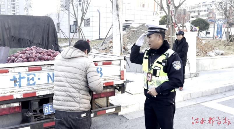 記者了解到,1月13日下午3時30分許,浮梁縣交警大隊縣城中隊輔警方斌和同事在城區(qū)道路上巡邏,當他們來到當?shù)匦虏下泛湍详柦纸粎R處時,看到一輛懸掛甘肅車牌、裝著一車廂蘋果的輕型貨車停放在路口處,不少市民正在選購蘋果。方斌告訴記者:“這兩條街道是縣城的主干道,附近有諸多商業(yè)店鋪和居民小區(qū),來往的機動車和電動車都特別多,屬于交通嚴管街。這輛車當時就違規(guī)停放在路口,極大影響了機動車輛的通行,存在交通安全隱患。”查核機動車駕駛人的駕駛證件過程中,方斌得知男子來自甘肅,車上的蘋果全是自家種植的。“感覺駕駛人大老遠跑到我們這來挺不容易的,所以我和同事就只是對其進行了交通勸導,沒有作其他的經濟處罰。駕駛人也挺理解和支持我們的工作,最后達到了保障交通暢通和安全的目的就行。”在幫助男子關閉車廂護欄的時候,方斌還不忘提醒男子“你可以把車開到寬敞點的地方,不影響道路暢通的地方去。”