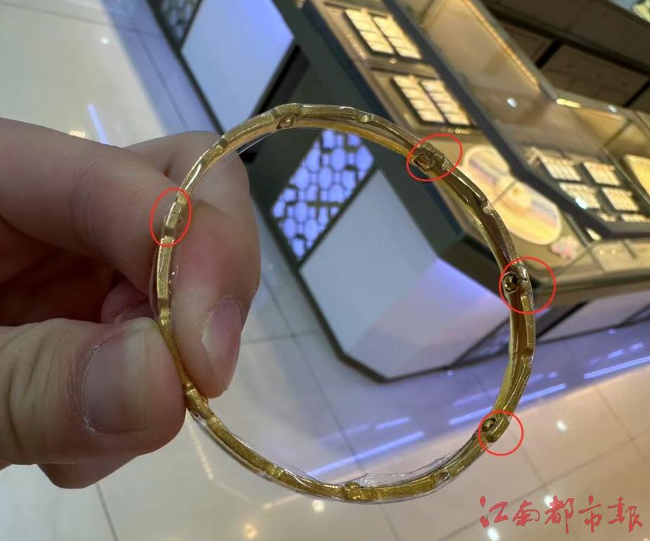 2月25日,記者和曾女士一同來到該店。記者看到,曾女士購買的金手鐲的確有幾處清晰的裂痕。該店負責人稱,裂痕系曾女士睡覺時擠壓變形導致的,“不能退款,只能換新金手鐲并收取加工費。”