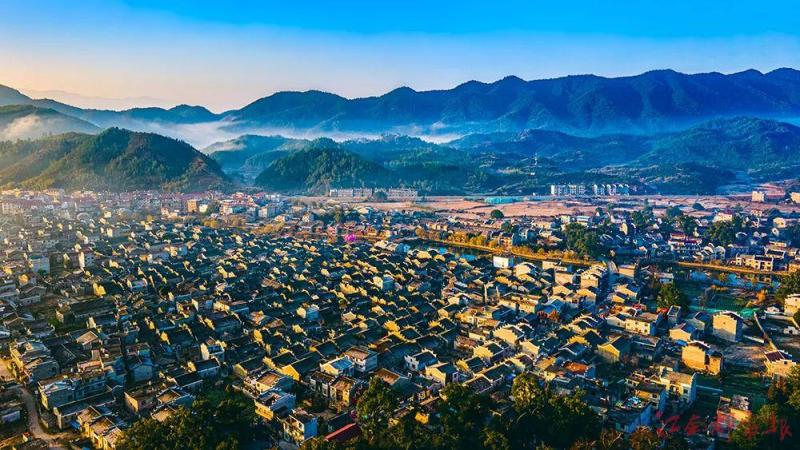 青山環(huán)抱、江水環(huán)繞的流坑古村。(歐陽順 攝)
