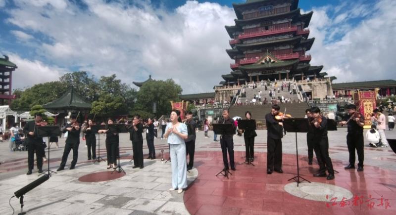 江南都市報訊 全媒體記者段萍攝影報道:“五一”假期,江西文旅推出“山水有戲·藝韻五一——文藝快閃點亮贛鄱景區(qū)”活動,全省11個設(shè)區(qū)市、22家景區(qū)聯(lián)袂打造近50場沉浸式戲曲快閃,一城一景一戲,讓如畫江西超“有戲”!5月5日上午,南昌交響樂團亮相滕王閣,演唱了《我在江西等你》《咱們工人有力量》《我和我的祖國》等3首歌曲,現(xiàn)場氣氛熱烈。