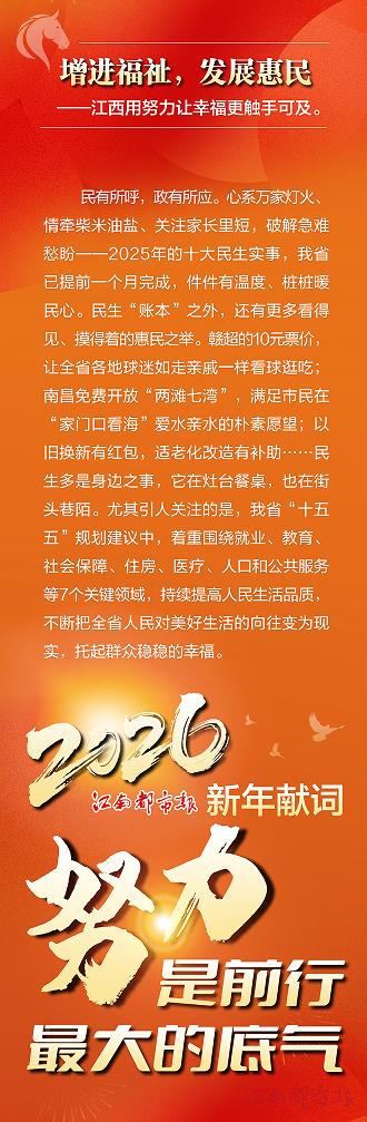 民有所呼,政有所應(yīng)。心系萬家燈火、情牽柴米油鹽、關(guān)注家長(zhǎng)里短,破解急難愁盼——2025年的十大民生實(shí)事,我省已提前一個(gè)月完成,件件有溫度、樁樁暖民心。民生“賬本”之外,還有更多看得見、摸得著的惠民之舉。贛超的10元票價(jià),讓全省各地球迷如走親戚一樣看球逛吃;南昌免費(fèi)開放“兩灘七灣”,滿足市民在“家門口看海”愛水親水的樸素愿望;以舊換新有紅包,適老化改造有補(bǔ)助……民生多是身邊之事,它在灶臺(tái)餐桌,也在街頭巷陌。尤其引人關(guān)注的是,我省“十五五”規(guī)劃建議中,著重圍繞就業(yè)、教育、社會(huì)保障、住房、醫(yī)療、人口和公共服務(wù)等7個(gè)關(guān)鍵領(lǐng)域,持續(xù)提高人民生活品質(zhì),不斷把全省人民對(duì)美好生活的向往變?yōu)楝F(xiàn)實(shí),托起群眾穩(wěn)穩(wěn)的幸福。