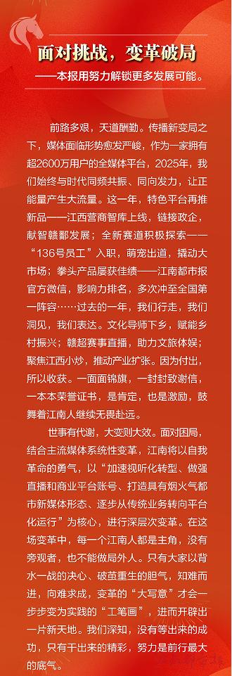前路多艱,天道酬勤。傳播新變局之下,媒體面臨形勢(shì)愈發(fā)嚴(yán)峻,作為一家擁有超2600萬用戶的全媒體平臺(tái),2025年,我們始終與時(shí)代同頻共振、同向發(fā)力,讓正能量產(chǎn)生大流量。這一年,特色平臺(tái)再推新品——江西營(yíng)商智庫(kù)上線,鏈接政企,獻(xiàn)智贛鄱發(fā)展;全新賽道積極探索——“136號(hào)員工”入職,萌寵出道,撬動(dòng)大市場(chǎng);拳頭產(chǎn)品屢獲佳績(jī)——江南都市報(bào)官方微信,影響力排名,多次沖至全國(guó)第一陣容……過去的一年,我們行走,我們洞見,我們表達(dá)。文化導(dǎo)師下鄉(xiāng),賦能鄉(xiāng)村振興;贛超賽事直播,助力文旅體娛;聚焦江西小炒,推動(dòng)產(chǎn)業(yè)擴(kuò)張。因?yàn)楦冻?,所以收獲。一面面錦旗,一封封致謝信,一本本榮譽(yù)證書,是肯定,也是激勵(lì),鼓舞著江南人繼續(xù)無畏赴遠(yuǎn)。