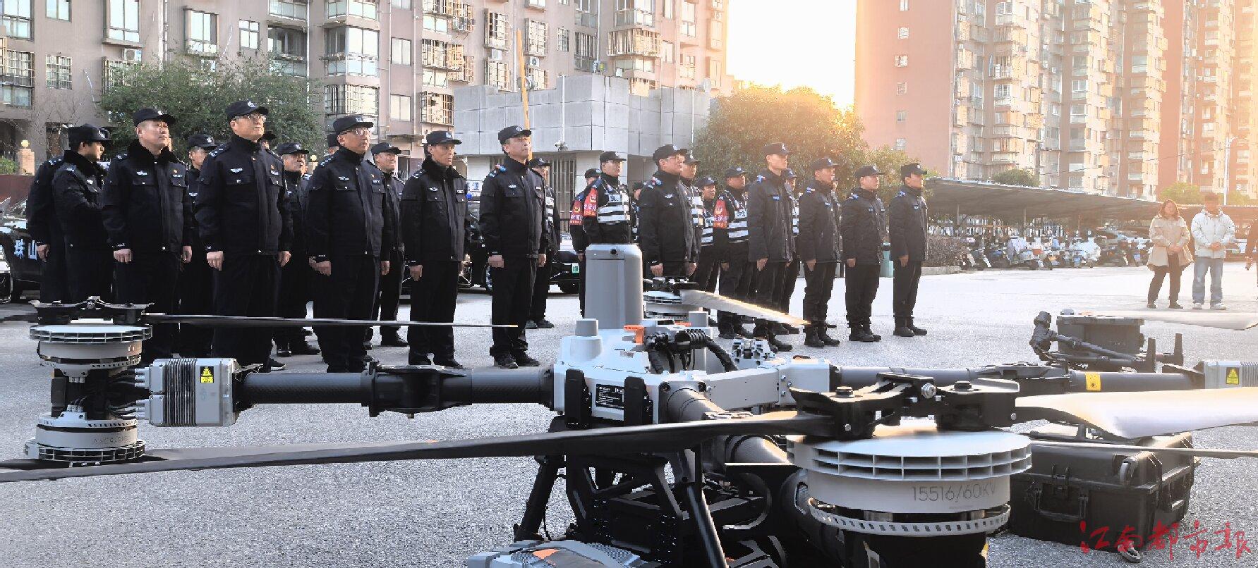本報訊 胡琪、全媒體記者余文斌攝影報道:為深入推進(jìn)科技興警戰(zhàn)略,構(gòu)建現(xiàn)代化、智能化社會治安防控體系,12月30日下午,珠山公安分局舉行空地協(xié)同立體化巡防啟動儀式。隨著多架警用無人機(jī)劃破長空,與地面巡邏力量同步響應(yīng),標(biāo)志著珠山區(qū)正式邁入“立體巡防、智慧管控”的新階段。在啟動儀式現(xiàn)場,景德鎮(zhèn)市公安局特巡警支隊支隊長江宏莊嚴(yán)地將“市公安局特巡警支隊珠山大隊”隊旗授予大隊長倪飛翔。隨著指揮員一聲令下,無人機(jī)操作手熟練操控,數(shù)架警用無人機(jī)應(yīng)聲而起,迅速爬升,在空中組成編隊,對周邊重點(diǎn)區(qū)域展開示范性巡航。實(shí)時畫面同步回傳至指揮中心大屏,城區(qū)街面狀況、交通流量、人員聚集情況一覽無余。據(jù)悉,此次投入使用的警用無人機(jī)隊伍,配備了多型號、多功能的先進(jìn)無人機(jī)平臺,集成了空中喊話、警燈警報及移動偵查等多種模塊。它們將成為公安機(jī)關(guān)的“空中移動哨所”,在提升巡邏廣度與密度、強(qiáng)化復(fù)雜區(qū)域監(jiān)測、助力精準(zhǔn)打擊犯罪、參與應(yīng)急救援等方面發(fā)揮不可替代的作用。珠山區(qū)副區(qū)長、公安分局局長于輝耀指出,組建專業(yè)化無人機(jī)巡防力量,是珠山分局黨委順應(yīng)警務(wù)現(xiàn)代化潮流,深化“智慧警務(wù)”建設(shè)的關(guān)鍵舉措。這支“空中奇兵”的加入,將徹底改變傳統(tǒng)地面巡邏的單一模式,形成“空中巡查、地面響應(yīng)、人機(jī)互動、數(shù)據(jù)賦能”的全新作戰(zhàn)格局,為守護(hù)珠山平安注入強(qiáng)大科技動能。分局將以此次啟動儀式為起點(diǎn),持續(xù)深化警用無人機(jī)在各類警務(wù)場景中的深度應(yīng)用與戰(zhàn)術(shù)融合,不斷加強(qiáng)專業(yè)隊伍建設(shè)和實(shí)戰(zhàn)技能訓(xùn)練,探索建立規(guī)范高效的“無人機(jī)+”警務(wù)運(yùn)行機(jī)制,努力將科技優(yōu)勢轉(zhuǎn)化為實(shí)實(shí)在在的戰(zhàn)斗力,全力打造更高水平的平安珠山,讓人民群眾切實(shí)感受到安全觸手可及、保障就在身邊。